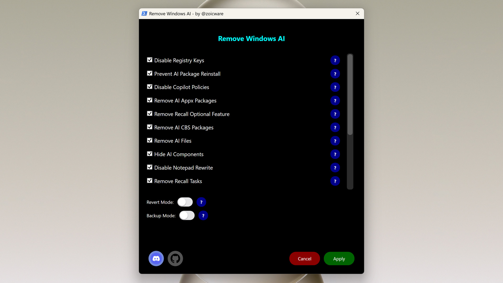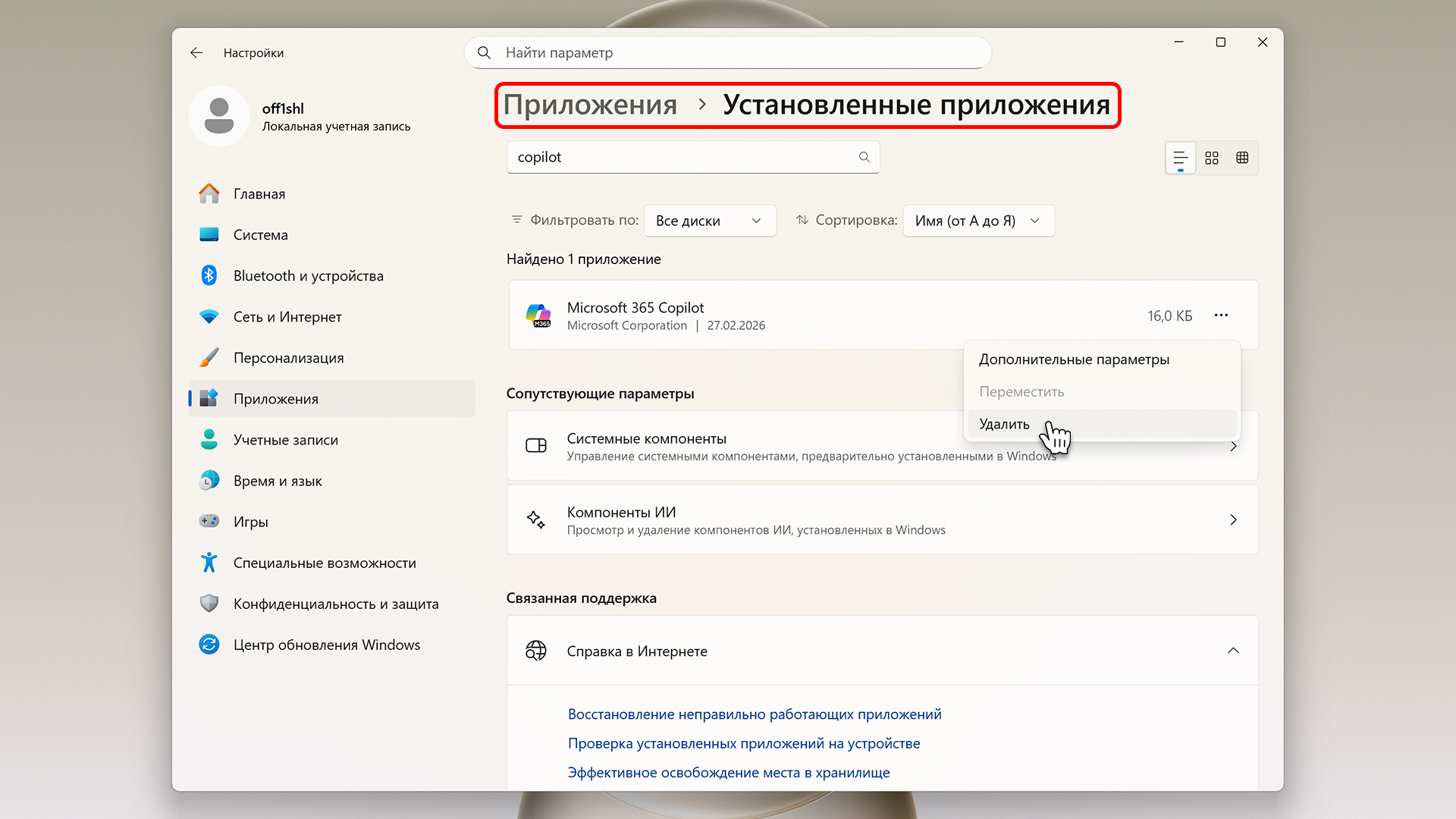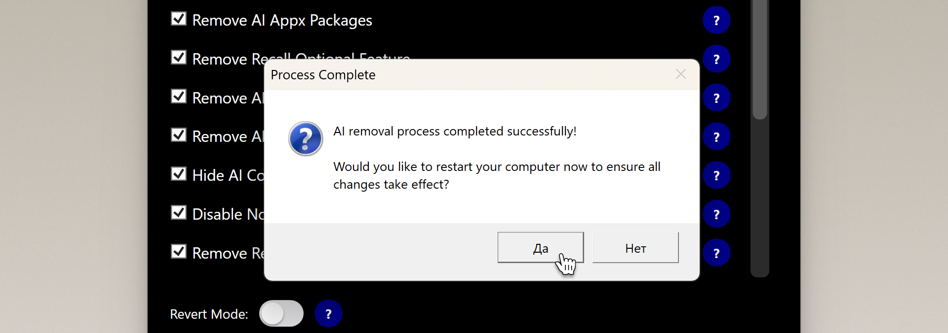 Назад OfficialBRO 02 Мар 2026 (Отредактировано: 02.03.2026) 26 0 Как отключить ИИ в Windows 11: полное удаление Copilot и Recall Содержание статьи [ скрыть ] Уровень 1. Базовое удаление приложения Copilot Уровень 2. Глубокая очистка с помощью Remove Windows AI Итог С каждым обновлением Microsoft добавляет всё больше функций искусственного интеллекта в Windows 11: от встроенного чат-бота Copilot и спорной функции постоянной записи экрана Recall до нейросетевых генераторов в Paint и Блокноте. Но эти функции нужны не всем. Программы ИИ работают постоянно, используют память компьютера и собирают данные о вашей работе. Если вы хотите, чтобы система работала быстрее и не следила за вами, ИИ можно выключить. Далее мы рассмотрим два варианта: простое визуальное отключение и глубокое удаление для опытных пользователей. Уровень 1. Базовое удаление приложения Copilot В последних сборках Windows 11 Copilot устанавливается как обычное отдельное веб-приложение. Чтобы убрать его иконку с панели задач, очистить контекстное меню и избавиться от визуальной интеграции в системе, достаточно просто удалить саму программу. Инструкция по удалению: Откройте Параметры (сочетание клавиш Win + I). Перейдите в раздел Приложения -> Установленные приложения. В строке поиска введите Copilot. Нажмите на три точки рядом с приложением и выберите Удалить. ✅ Готово! Этого вполне достаточно, чтобы визуально очистить систему от назойливого чат-бота. Однако стоит учитывать, что фоновые службы ИИ и скрытая телеметрия всё ещё остаются в Windows. Уровень 2. Глубокая очистка с помощью Remove Windows AI Чтобы полностью убрать все нейросети из Windows, энтузиасты сделали бесплатный инструмент — Remove Windows AI. Этот скрипт не просто прячет значки, а полностью удаляет Copilot, Recall, отслеживание ввода текста и ИИ-модули из Paint, Edge и системных настроек. ⚠️ Важно: Перед использованием любых скриптов для очистки настоятельно рекомендуем прочитать нашу статью: Точка восстановления Windows 10 и 11: как сделать бэкап системы и создать резервную копию. Если что-то пойдет не так или вы захотите вернуть ИИ в будущем, вы сможете откатить систему за две минуты. Как использовать утилиту: 1. Нажмите правой кнопкой мыши на меню «Пуск» и выберите Терминал (Администратор) или Windows PowerShell (Администратор). 2. Скопируйте и вставьте следующую команду, после чего нажмите Enter: & ([scriptblock]::Create((irm "https://raw.githubusercontent.com/zoicware/RemoveWindowsAI/main/RemoveWindowsAi.ps1"))) 3. Откроется графический интерфейс скрипта. Здесь собраны чекбоксы для тотального удаления ИИ. Вы можете отметить всё сразу или выбрать пункты точечно: Disable Registry Keys & Copilot Policies — отключает ИИ на уровне реестра и групповых политик. Remove AI Appx / CBS Packages / Files — физически удаляет скрытые пакеты приложений и установочные файлы нейросетей с диска. Remove Recall Optional Feature & Tasks — полностью вычищает компоненты функции постоянной записи экрана и её фоновые задачи. Disable Notepad Rewrite — убирает навязчивую функцию переписывания текста ИИ в стандартном Блокноте. Prevent AI Package Reinstall — блокирует Центр обновлений, чтобы Microsoft не вернула ИИ обратно при следующем апдейте. Скрипт также позволяет в один клик вернуть быстрые и легкие аналоги программ из прошлых версий Windows: Классический просмотрщик фото (Photoviewer) и Photos Legacy. Старый добрый MS Paint без функции Cocreator. Классические Ножницы (Snipping Tool) и Блокнот (Notepad). Ползунок Backup Mode создаёт резервную копию изменяемых параметров, а Revert Mode возвращает их в исходное состояни