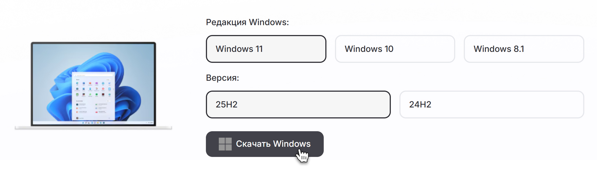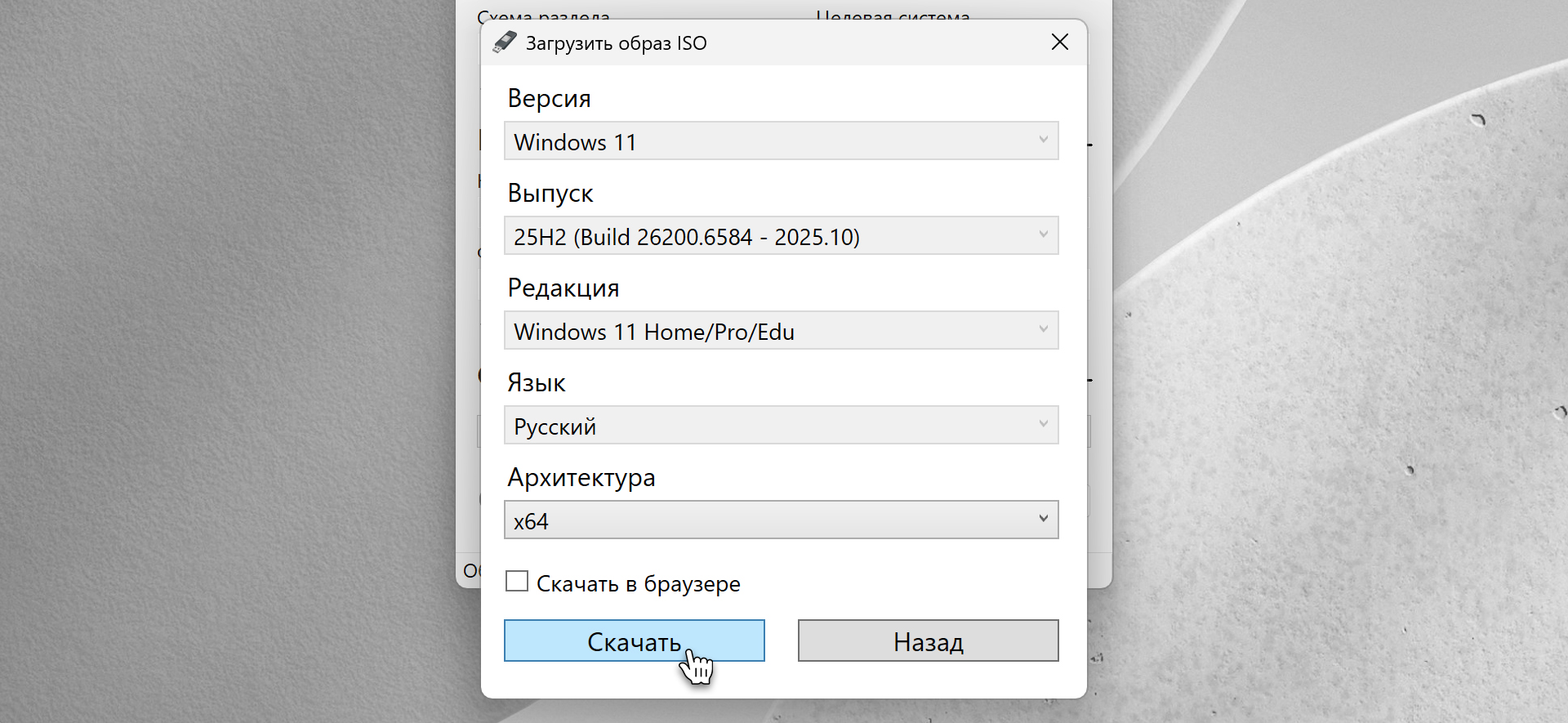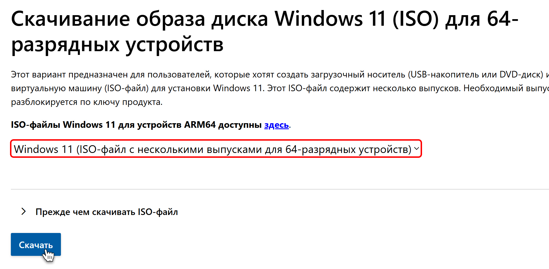 Назад OfficialBRO 20 Мар 2026 (Отредактировано: 20.03.2026) 16 0 Где и как скачать оригинальный образ Windows 11 (ISO): 4 рабочих способа (2026) Содержание статьи [ скрыть ] Способ 1. Фирменный загрузчик Keysoft (Без VPN и ограничений) Способ 2. Через официальный сайт Microsoft Способ 3. Использование Media Creation Tool Способ 4. Через программу Rufus Итог Нужно переустановить Windows 11 или накатить систему на новый ПК? Первое, что вам понадобится — это чистый оригинальный ISO-образ. Ниже мы собрали 4 актуальных и на 100% рабочих способа безопасно загрузить оригинальный образ Windows 11 напрямую от разработчиков. 💡 Совет: Пошаговое руководство по дальнейшему процессу установки вы можете найти в нашей статье: Rufus — от создания загрузочной флешки до установки Windows. Способ 1. Фирменный загрузчик Keysoft (Без VPN и ограничений) Самый быстрый и удобный способ для пользователей из России и РБ, которым надоело бороться с ошибками и региональными блоками на сайте Microsoft. Мы подняли собственный сервис для безопасной загрузки оригинальных образов. Инструкция: 1. Перейдите на нашу специальную страницу. 2. Выберите нужную версию Windows 11 и язык системы. 3. Нажмите кнопку «Скачать». 4. Загрузка начнется на максимальной скорости вашего провайдера без каких-либо региональных блокировок. Вы получаете абсолютно чистый, нетронутый образ напрямую с серверов. Способ 2. Через официальный сайт Microsoft Если вы находитесь вне региональных блокировок или используете надежный VPN, можно скачать образ напрямую через браузер. Инструкция: 1. Зайдите на официальную страницу загрузки Windows 11. 2. Прокрутите страницу до раздела «Скачивание образа диска Windows 11 (ISO)». В выпадающем меню выберите Windows 11 и нажмите «Скачать». 3. Выберите язык продукта и подтвердите действие. 4. Нажмите на появившуюся кнопку «Скачать». Ссылка сгенерируется специально для вас и будет активна 24 часа. Способ 3. Использование Media Creation Tool Утилита Media Creation Tool (MCT) от Microsoft — это классический инструмент, который умеет не только скачивать ISO-файлы, но и сразу записывать их на флешку. (Для РФ также потребуется VPN на этапе запуска утилиты). Инструкция: 1. На той же официальной странице Microsoft в разделе «Создание установочного носителя Windows 11» нажмите «Скачать». 2. Запустите скачанный файл MediaCreationTool.exe и примите лицензионное соглашение. 3. Выберите язык и выпуск системы. 4. На экране выбора носителя выберите «ISO-файл» и нажмите «Далее». Или выберите «USB-устройство флэш-памяти», чтобы сразу установить образ на флешку. 5. Укажите папку для сохранения, и утилита начнет загрузку чистого образа. Способ 4. Через программу Rufus Rufus — легендарная бесплатная программа для создания загрузочных флешек, которая имеет встроенный инструмент загрузки образов. Инструкция: 1. Скачайте Rufus и запустите ее. 2. В главном окне, справа от кнопки «ВЫБРАТЬ», нажмите на стрелочку и переключите режим на «СКАЧАТЬ». 3. Нажмите на саму кнопку «СКАЧАТЬ». 4. В появившемся скрипте выберите версию Windows 11, нужный билд, редакцию и язык. Нажмите «Скачать». 5. Выберите место для сохранения ISO-файла и дождитесь скачивания. Итог Скачать чистый образ Windows 11 — это лишь первый шаг к стабильной работе вашего компьютера. Используя любой из этих 4 способов, вы гарантированно защитите себя от вирусов, интегрированных майнеров и вырезанных системных служб, которыми так славятся пиратские сборки с торрентов. В завершение напомним: чтобы скачанная 