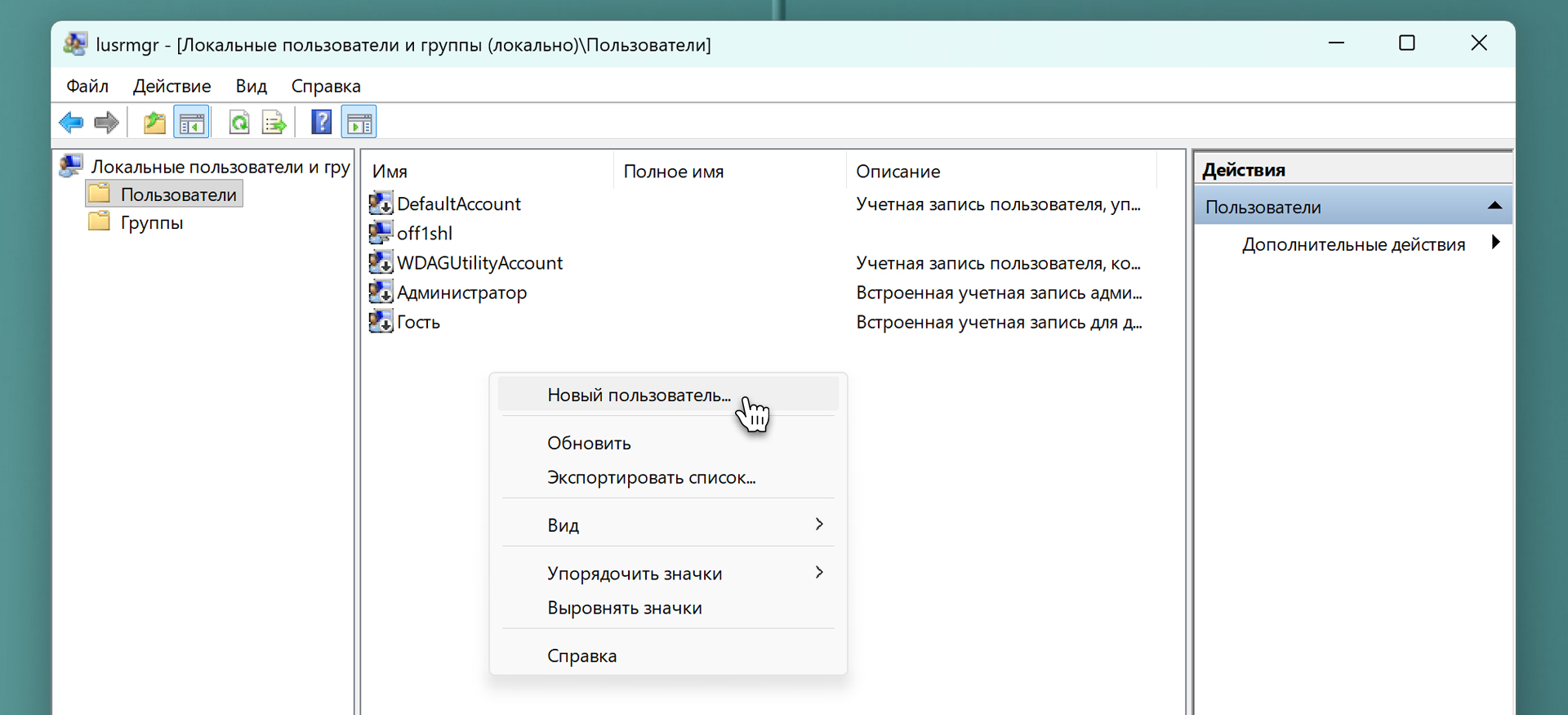 Кликните правой кнопкой мыши по пустому месту и выберите Новый пользователь...