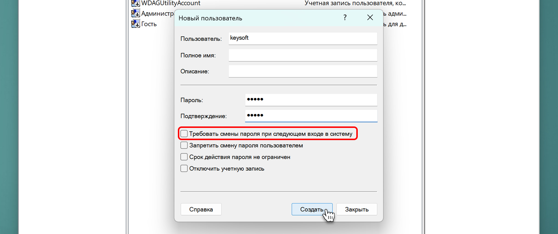 Заполните данные профиля, снимите галочку «Требовать смены пароля при следующем входе» и нажмите «Создать».
