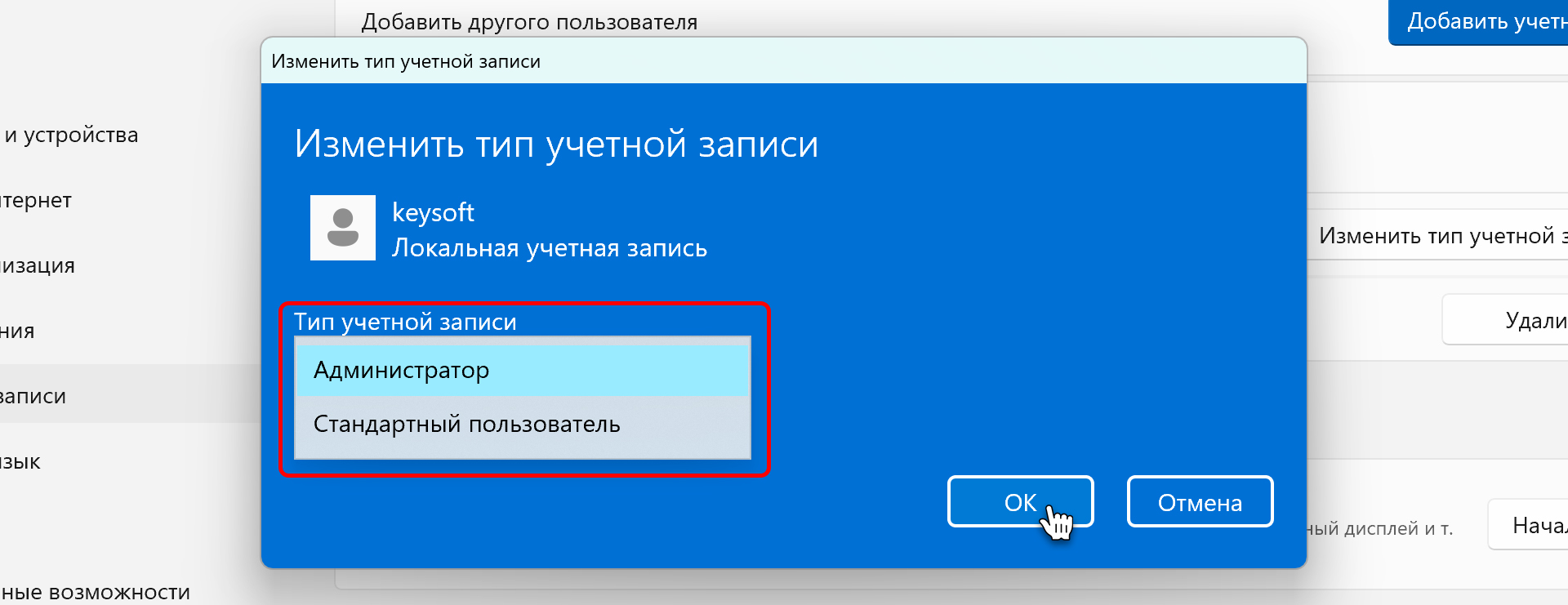 В выпадающем меню выберите «Администратор» (или «Стандартный пользователь», чтобы забрать права) и нажмите ОК.