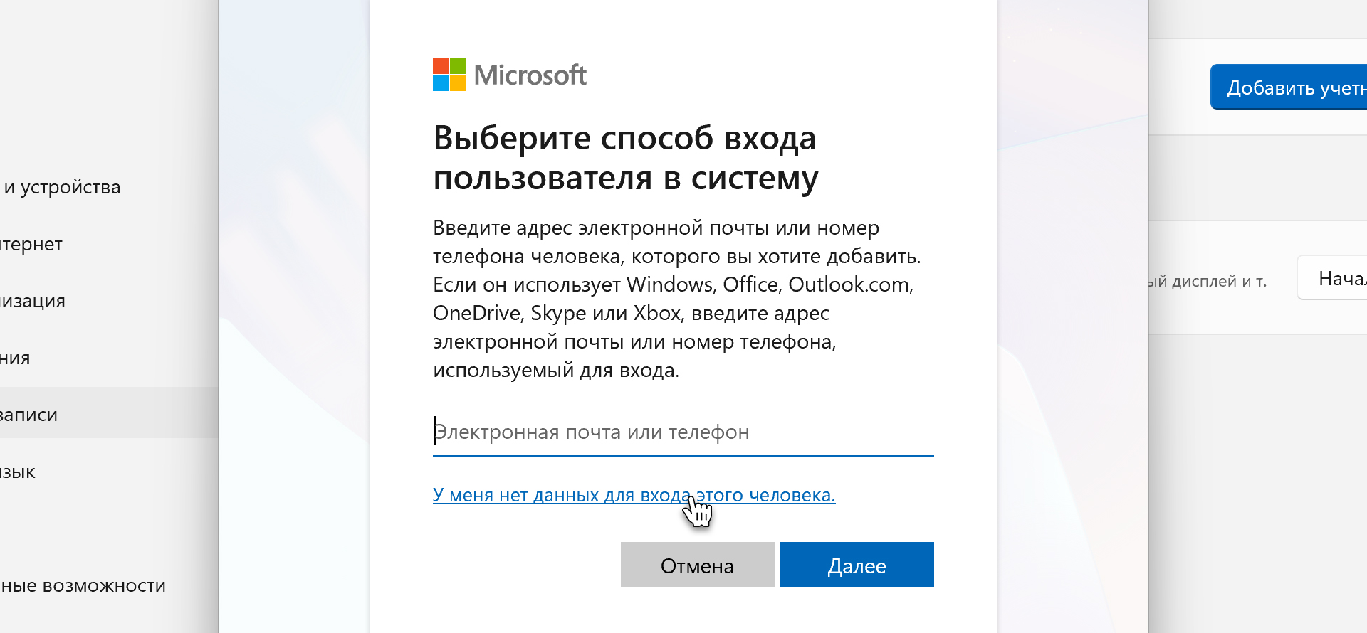 Появится окно авторизации Microsoft. Если вам нужна именно локальная учетка, нажмите синюю ссылку «У меня нет данных для входа этого человека».