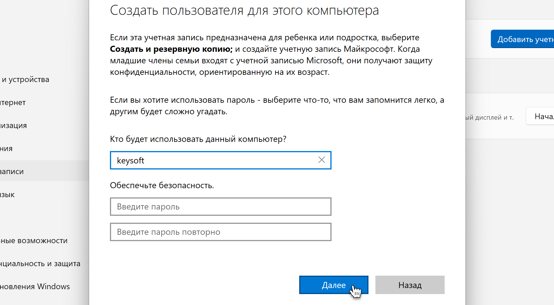Введите желаемое имя пользователя, пароль (по желанию) и нажмите «Далее». Готово!