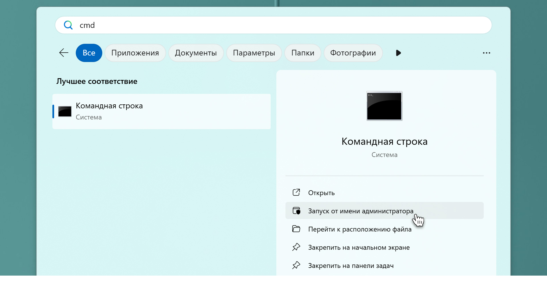 Откройте меню Пуск, введите в поиске cmd. Кликните правой кнопкой мыши по «Командная строка» и выберите Запуск от имени администратора.