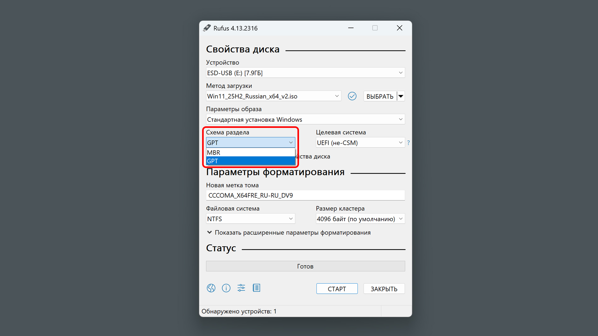 Назад OfficialBRO 24 Апр 2026 (Отредактировано: 24.04.2026) 25 0 MBR или GPT в Rufus: какую схему разделов выбрать для загрузочной флешки Содержание статьи [ скрыть ] Краткий ответ: выбирайте GPT Как узнать, какой формат диска у вас сейчас? В каких случаях нужно выбирать MBR? Почему флешка правильная, а установка всё равно выдаёт ошибку? Если вы читали нашу статью Rufus — от создания загрузочной флешки до установки Windows, вероятно, зависли над выпадающим списком, когда программа просит выбрать целевую систему: MBR или GPT. Если выбрать неправильно, установка Windows прервётся ошибкой на этапе выбора диска. Давайте разберём, что значат эти буквы и как с первой попытки сделать правильный выбор. / Краткий ответ: выбирайте GPT Если вашему компьютеру или ноутбуку меньше 10 лет, и вы собираетесь устанавливать Windows 11 или последнюю версию Windows 10, то смело выбирайте GPT (UEFI). Почему GPT это современный стандарт: Обязательные требования. Такие функции безопасности, как Secure Boot, работают только в режиме UEFI с дисками формата GPT. Объём памяти. Формат MBR физически не видит жёсткие диски объёмом более 2 ТБ. GPT снимает это ограничение. Количество разделов. Сама Windows при установке создаёт несколько скрытых системных разделов (восстановление, загрузчик). MBR ограничен всего 4 основными разделами, в то время как GPT поддерживает до 128. / Как узнать, какой формат диска у вас сейчас? Если вы переустанавливаете систему и не хотите полностью удалять все файлы с жёсткого диска, вам нужно создать флешку в том же формате, в котором уже работает ваш диск. Быстрая проверка в Windows: 1 Нажмите Win + R, введите команду msinfo32 и нажмите Enter. 2 В открывшемся окне найдите строку «Режим BIOS». ➔ Если там указано «UEFI» — ваш диск имеет формат GPT. ➔ Если указано «Устаревший» (Legacy) — ваш диск имеет формат MBR. 💡 Совет: Если у вас современный ПК, но диск оказался в формате MBR, имеет смысл создать флешку в GPT. При установке Windows вам нужно будет полностью удалить все разделы на системном диске, и установщик сам автоматически конвертирует его в правильный формат GPT. / В каких случаях нужно выбирать MBR? Старый добрый MBR вместе с режимом загрузки Legacy/CSM сегодня нужен только как запасной вариант для совместимости. Выбирайте MBR, если: У вас очень старый компьютер или ноутбук (выпущенный до 2015 года), материнская плата которого физически не поддерживает современную UEFI-загрузку. Вы пытаетесь установить старую операционную систему, например, 32-битную версию Windows 7, которая не содержит загрузчика для UEFI. На вашем диске уже стоит ОС в режиме Legacy, вы хотите поставить вторую систему рядом и не можете отформатировать диск. / Почему флешка правильная, а установка всё равно выдаёт ошибку? Иногда вы делаете всё по инструкции: выбираете нужный формат GPT, запускаете ПК, но во время установки получаете чёрный экран или ошибки при копировании файлов. Чаще всего причина кроется не в формате флешки, а в самом ISO-образе Windows. Если вы скачали сборку с торрентов, из которой вырезали системные службы, загрузчик такой системы может конфликтовать с материнской платой. Чтобы избежать танцев с бубном: Всегда записывайте на флешку только чистый, оригинальный образ системы. А чтобы система работала стабильно, получала все нужные драйверы и не блокировала функции из-за отсутствия активации — используйте официальный лицензионный ключ. Windows 11 Pro (Профессиональная) Купить за 1990 рублей Window